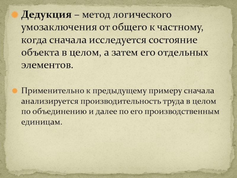 Слайд 21Дедукция – метод логического умозаключения от общего к частному, когда сначала