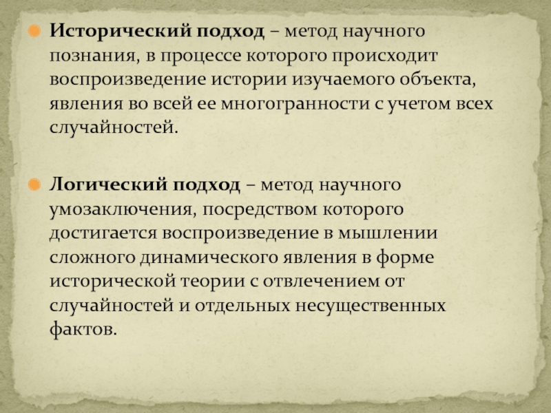 Логический подход – метод научного умозаключения, посредством которого достигается воспроизведение в мышлении сложного динамического явления в форме исторической теории с отвлечением от случайностей и отдельных несущественных фактов.