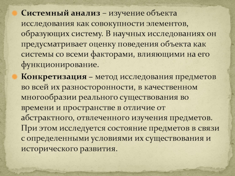Конкретизация – метод исследования предметов во всей их разносторонности, в качественном многообразии реального существования во времени и пространстве в отличие от абстрактного, отвлеченного изучения предметов. При этом исследуется состояние предметов в связи с определенными условиями их существования и исторического развития.