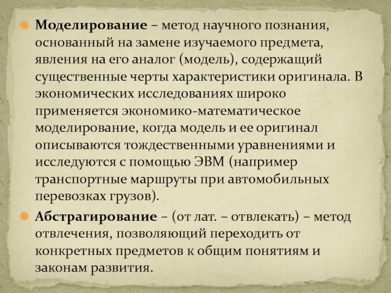 экономических исследованиях широко применяется экономико-математическое моделирование, когда модель и ее оригинал описываются тождественными уравнениями и исследуются с помощью ЭВМ (например транспортные маршруты при автомобильных перевозках грузов).