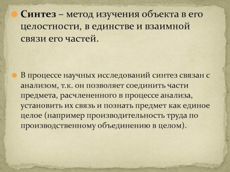 Слайд 19Синтез – метод изучения объекта в его целостности, в единстве и