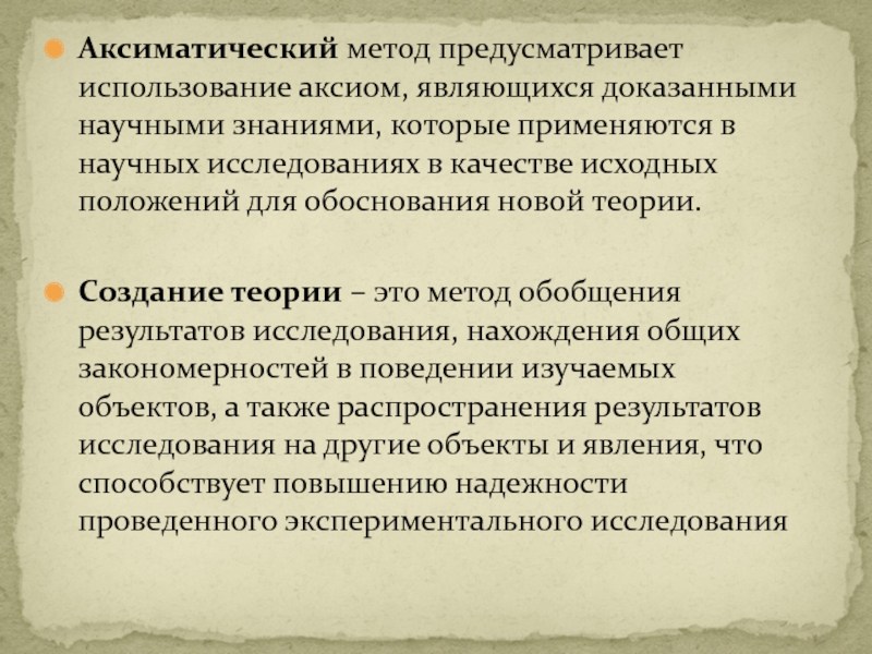 Слайд 30Аксиматический метод предусматривает использование аксиом, являющихся доказанными научными знаниями, которые