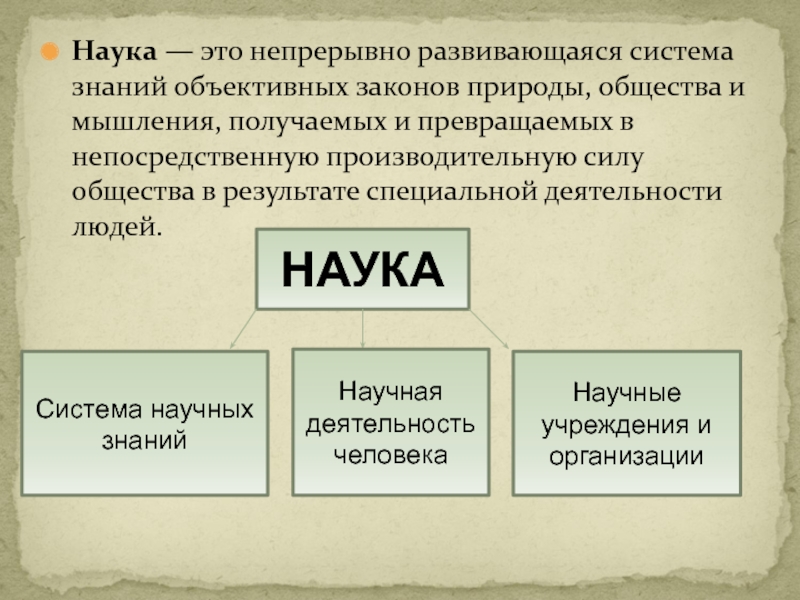 Слайд 2Наука — это непрерывно развивающаяся система знаний объективных законов природы,