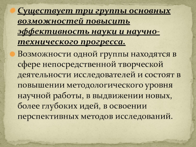 Слайд 13Существует три группы основных возможностей повысить эффективность науки и научно-технического