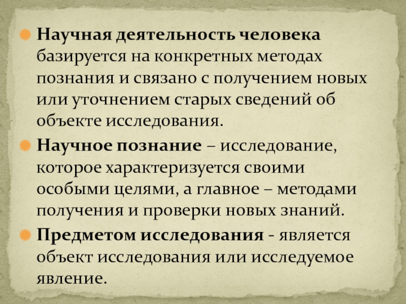 Слайд 6Научная деятельность человека базируется на конкретных методах познания и связано