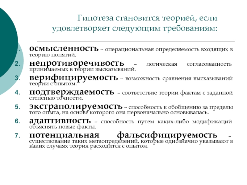 Гипотеза становится теорией, если удовлетворяет следующим требованиям: