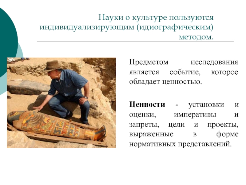 Науки о культуре пользуются индивидуализирующим (идиографическим) методом.
