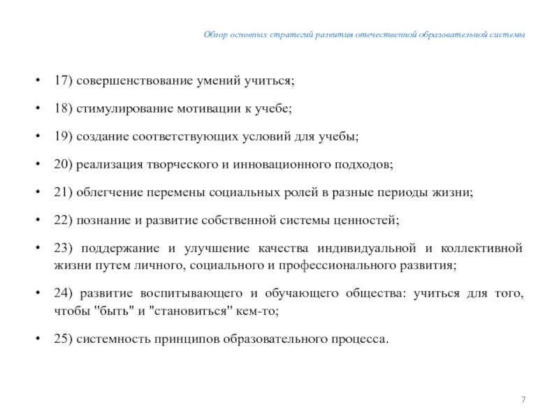 Слайд 7Обзор основных стратегий развития отечественной образовательной системы