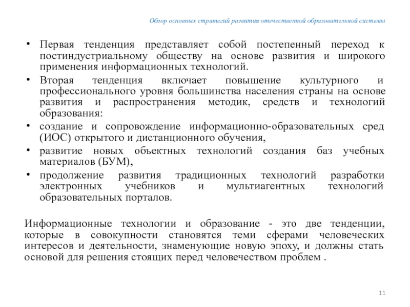 Слайд 11Обзор основных стратегий развития отечественной образовательной системы