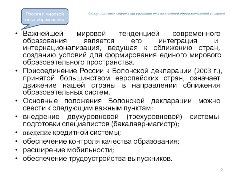 Присоединение России к Болонской декларации (2003 г.), принятой большинством европейских стран, означает движение нашей страны в направлении сближения образовательных систем.