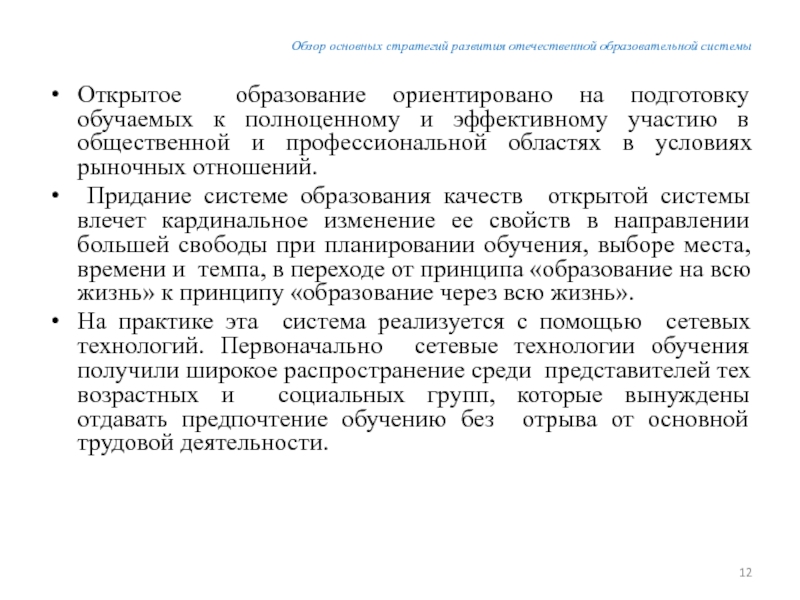 Слайд 12Обзор основных стратегий развития отечественной образовательной системы