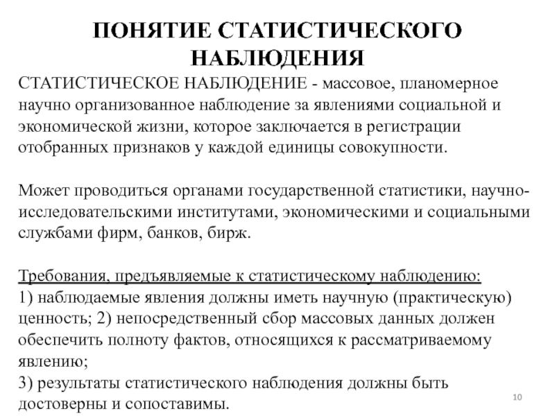 Слайд 10ПОНЯТИЕ СТАТИСТИЧЕСКОГО НАБЛЮДЕНИЯ