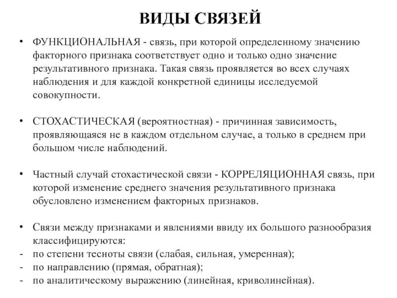 Связи между признаками и явлениями ввиду их большого разнообразия классифицируются: