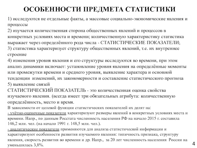 Слайд 4ОСОБЕННОСТИ ПРЕДМЕТА СТАТИСТИКИ