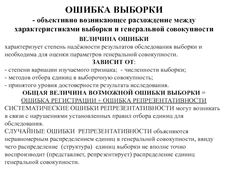 СЛУЧАЙНЫЕ ОШИБКИ РЕПРЕЗЕНТАТИВНОСТИ объясняются неравномерным распределением единиц в генеральной совокупности, ввиду чего распределение (структура) единиц выборки не вполне точно воспроизводит (представляет, репрезентирует) распределение единиц генеральной совокупности.