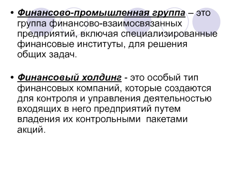 Слайд 25Финансово-промышленная группа – это группа финансово-взаимосвязанных предприятий, включая специализированные финансовые
