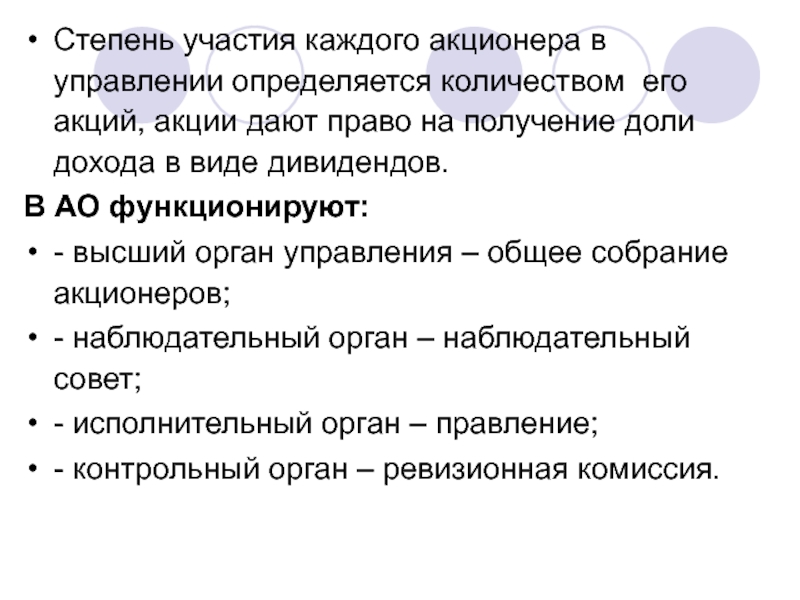 Слайд 15Степень участия каждого акционера в управлении определяется количеством его акций,