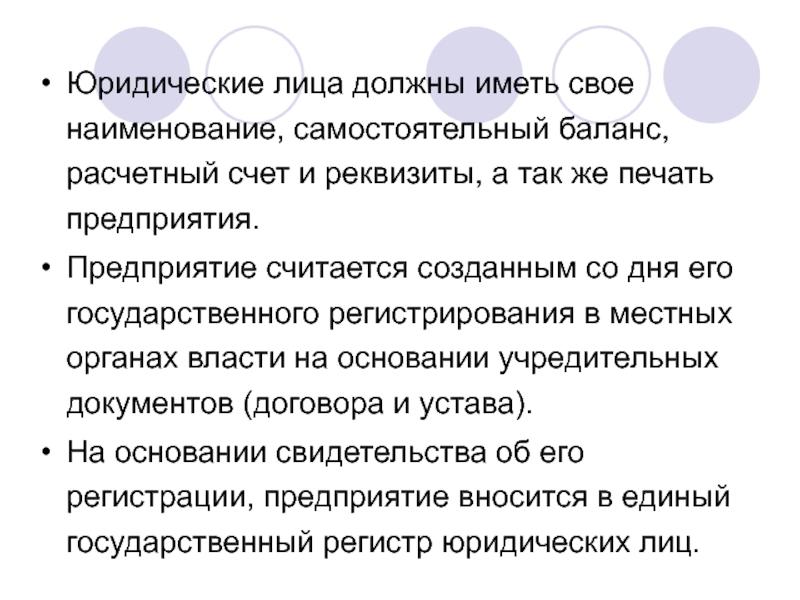 Слайд 3Юридические лица должны иметь свое наименование, самостоятельный баланс, расчетный счет