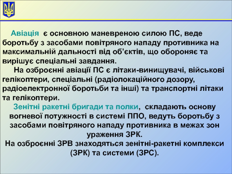 Слайд 7 Авіація є основною маневреною силою ПС, веде боротьбу