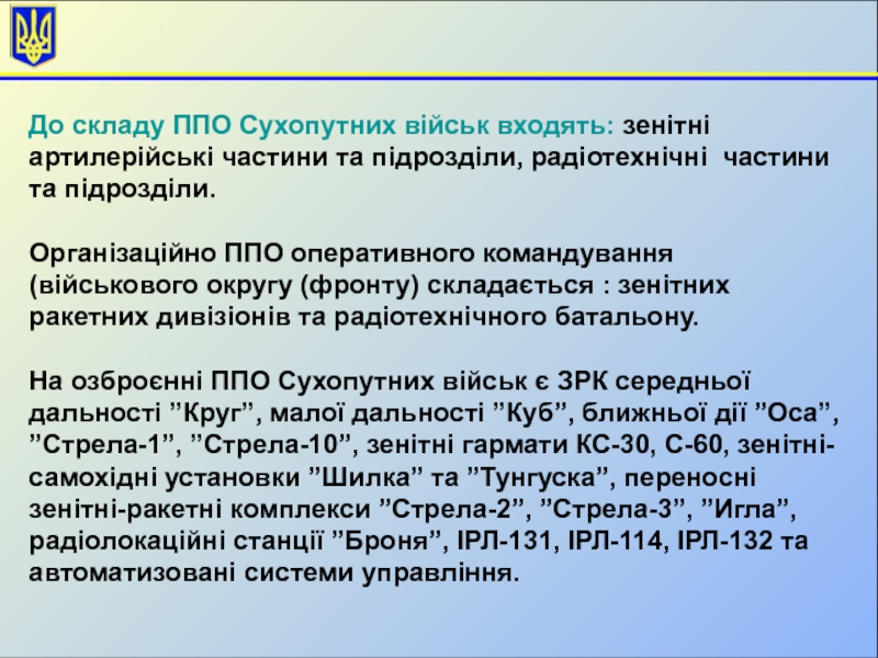 Слайд 15До складу ППО Сухопутних військ входять: зенітні артилерійські частини та