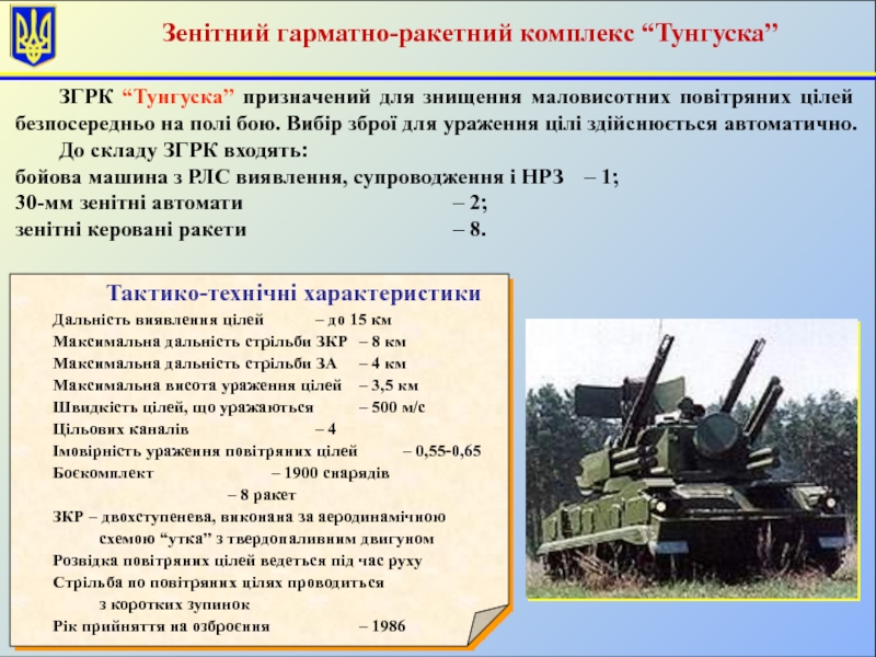 ЗГРК “Тунгуска” призначений для знищення маловисотних повітряних цілей безпосередньо на полі бою. Вибір зброї для ураження цілі здійснюється автоматично.