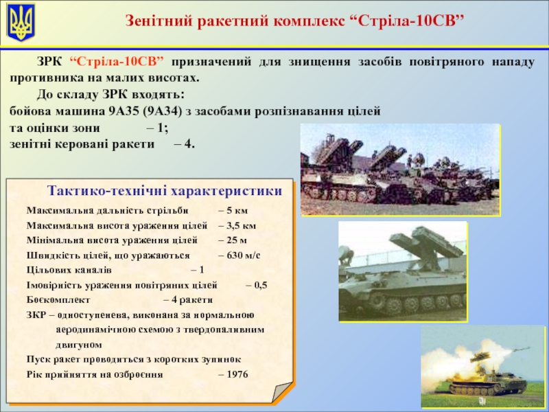 ЗРК “Стріла-10СВ” призначений для знищення засобів повітряного нападу противника на малих висотах.