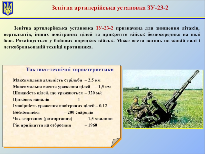 Зенітна артилерійська установка ЗУ-23-2 призначена для знищення літаків, вертольотів, інших повітряних цілей та прикриття військ безпосередньо на полі бою. Розміщується у бойових порядках військ. Може вести вогонь по живій силі і легкоброньованій техніці противника.