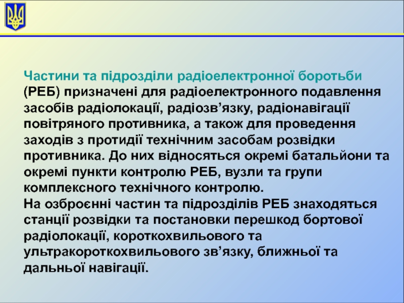 Слайд 9Частини та підрозділи радіоелектронної боротьби (РЕБ) призначені для радіоелектронного подавлення