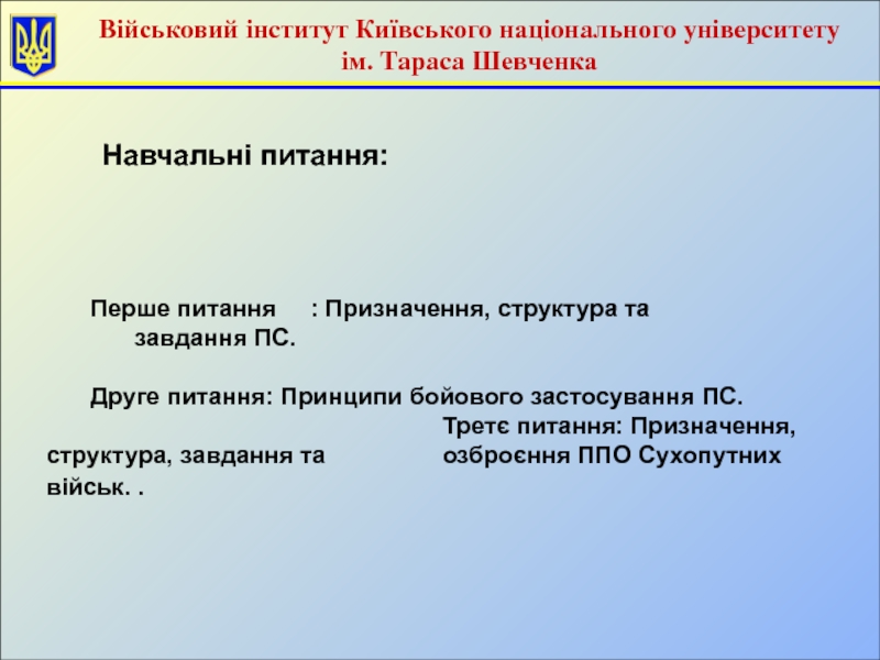 Слайд 1Тема 1. ПРОТИПОВІТРЯНА ОБОРОНА ВІЙСЬК ТА ОБ’ЄКТІВ