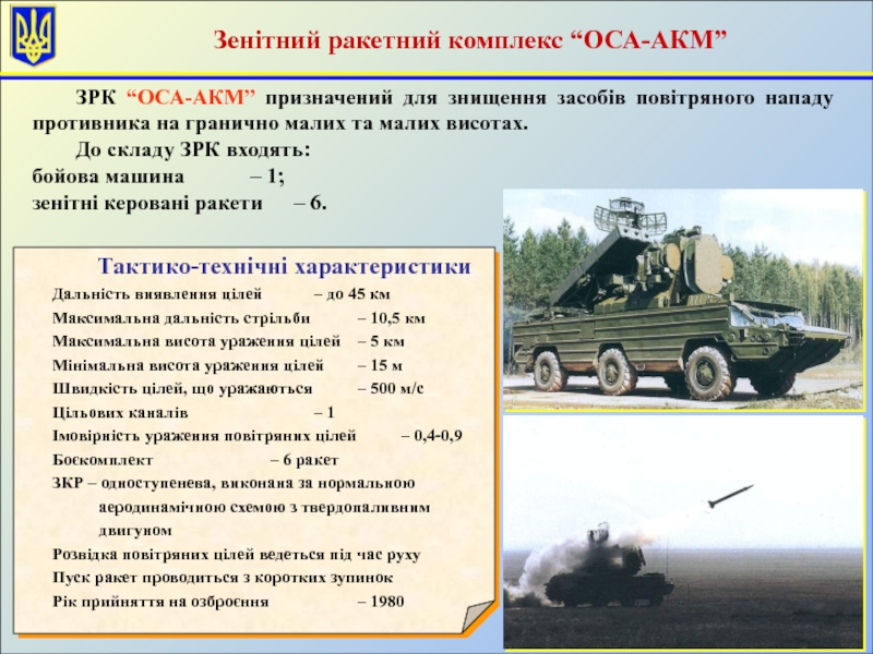 ЗРК “ОСА-АКМ” призначений для знищення засобів повітряного нападу противника на гранично малих та малих висотах.
