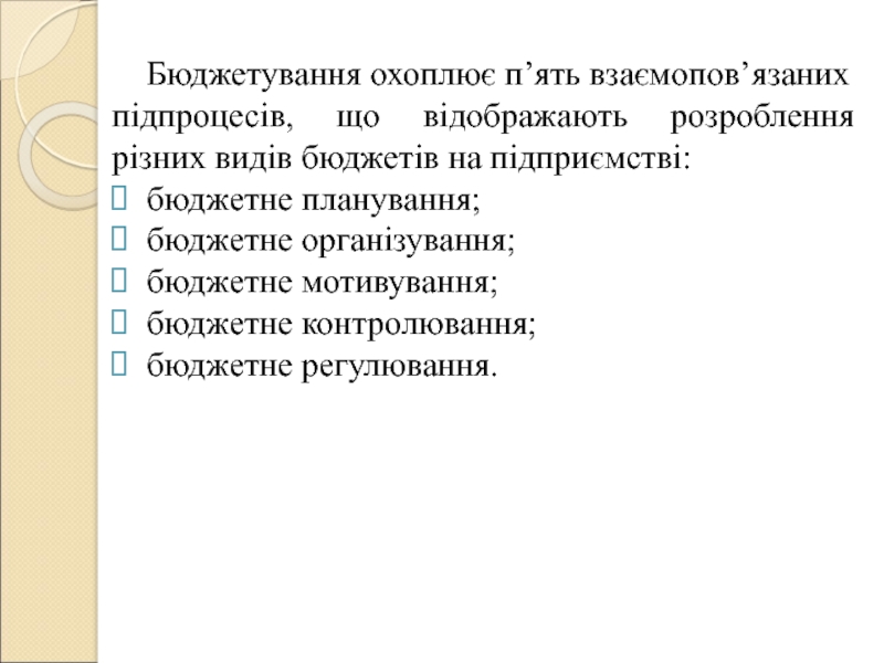 Слайд 11Бюджетування охоплює п’ять взаємопов’язаних підпроцесів, що відображають розроблення різних видів