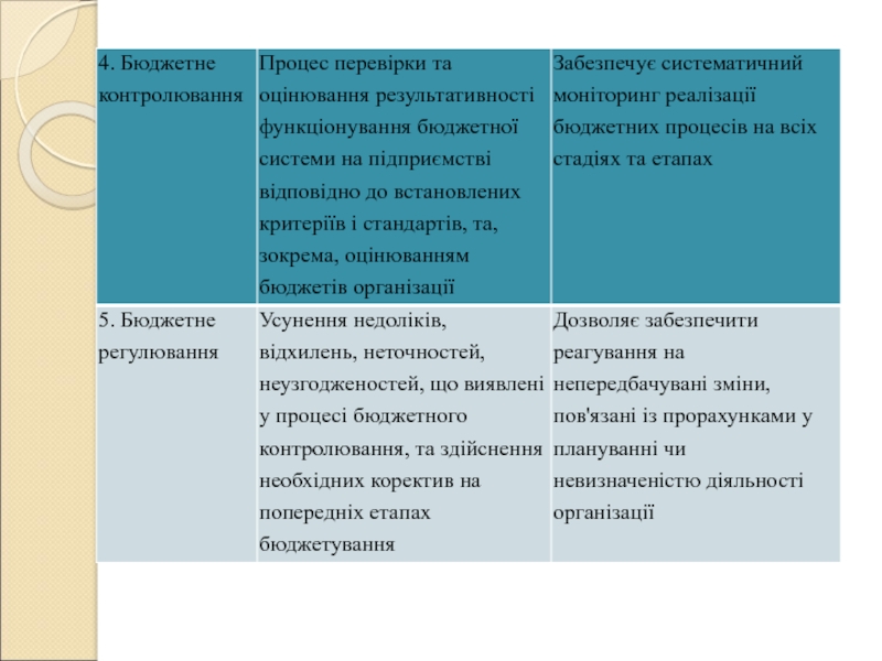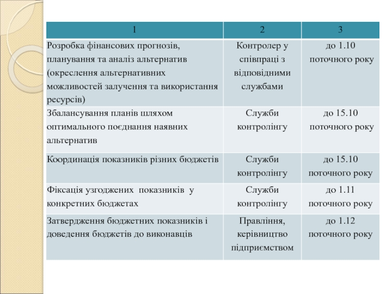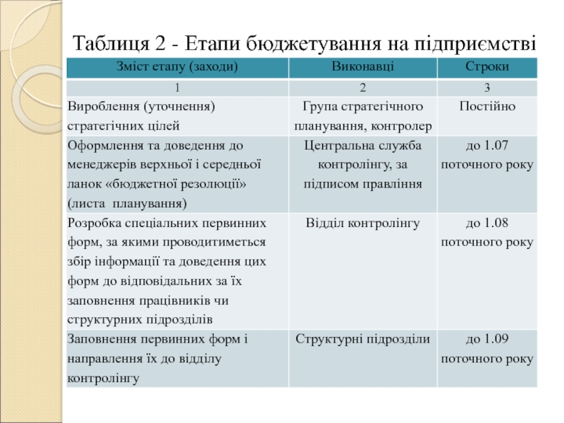 Слайд 29Таблиця 2 - Етапи бюджетування на підприємстві