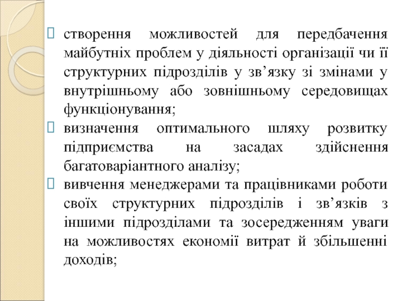 Слайд 16створення можливостей для передбачення майбутніх проблем у діяльності організації чи