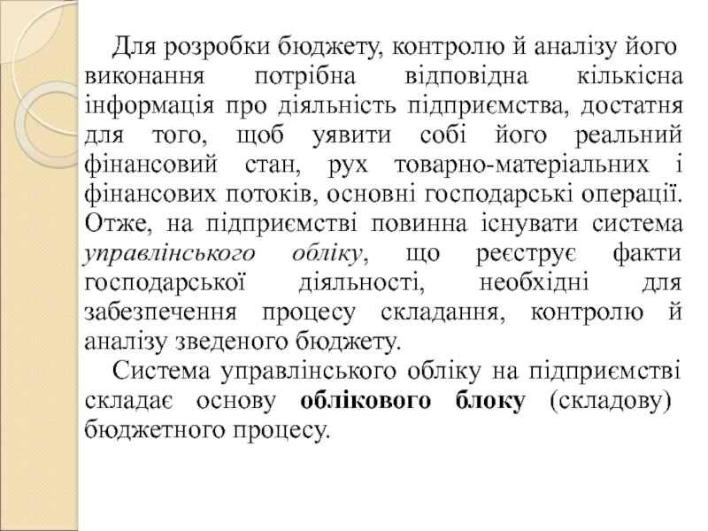 Система управлінського обліку на підприємстві складає основу облікового блоку (складову) бюджетного процесу.