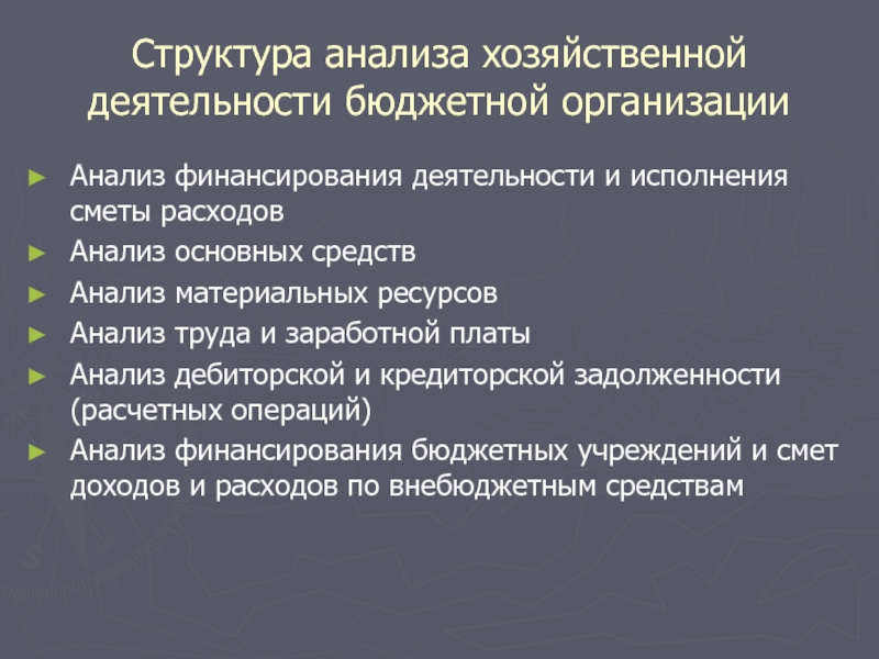 Слайд 9Структура анализа хозяйственной деятельности бюджетной организации