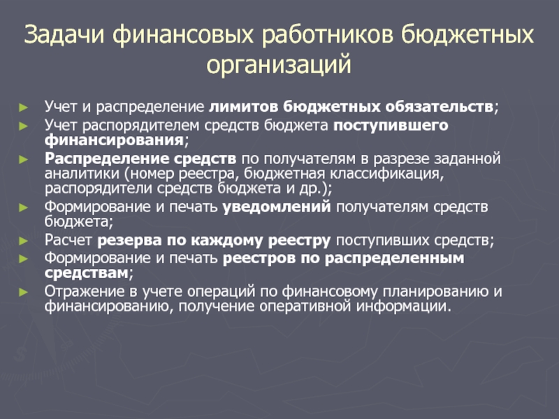 Слайд 7Задачи финансовых работников бюджетных организаций