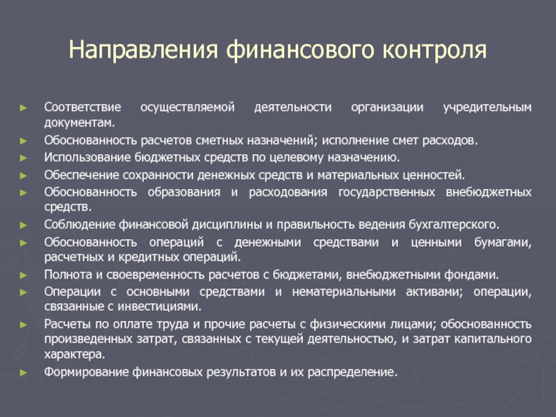 - службу по обеспечению финансового контроля за нижестоящими подразделениями в структуре главных распределителей бюджетных ассигнований и распорядителей бюджетных ассигнований, за целевым и рациональным использованием средств, за качеством составления смет доходов и расходов нижестоящих структур;