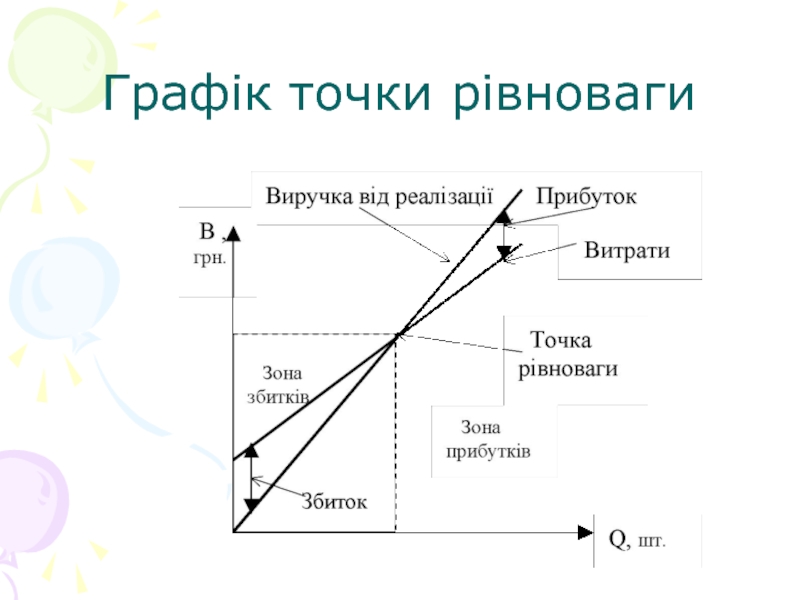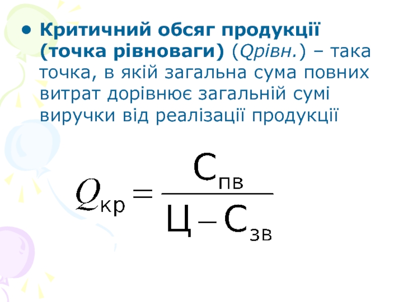 Слайд 38Критичний обсяг продукції (точка рівноваги) (Qрівн.) – така точка, в