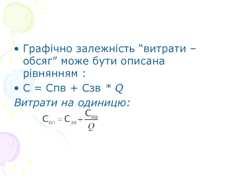 Слайд 36Графічно залежність “витрати – обсяг” може бути описана рівнянням :