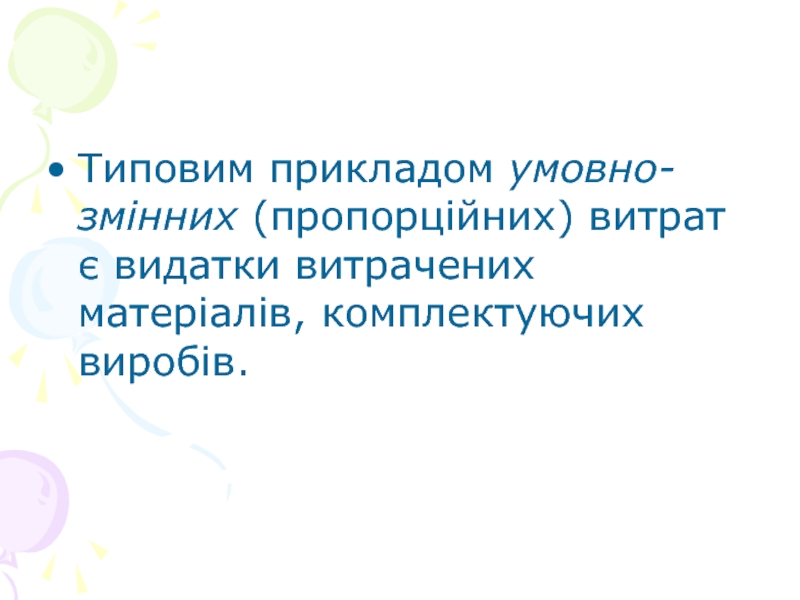 Слайд 34Типовим прикладом умовно-змінних (пропорційних) витрат є видатки витрачених матеріалів, комплектуючих