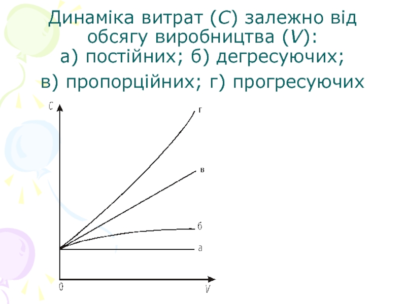 Слайд 10Динаміка витрат (С) залежно від обсягу виробництва (V):
