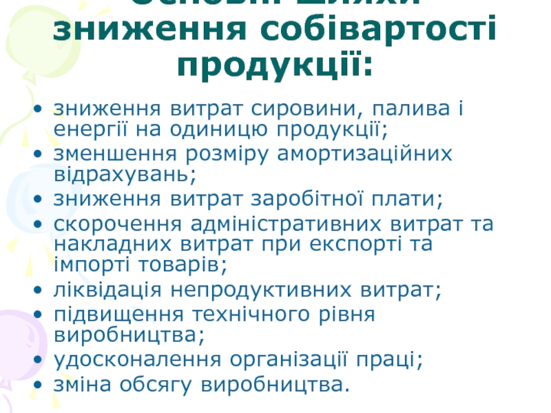 Слайд 57Основні шляхи зниження собівартості продукції: