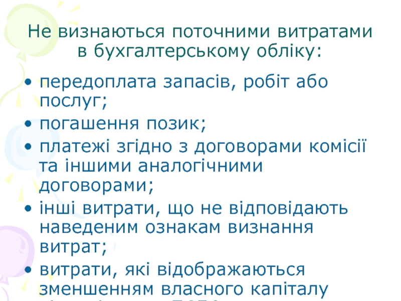 Слайд 13Не визнаються поточними витратами в бухгалтерському обліку:
