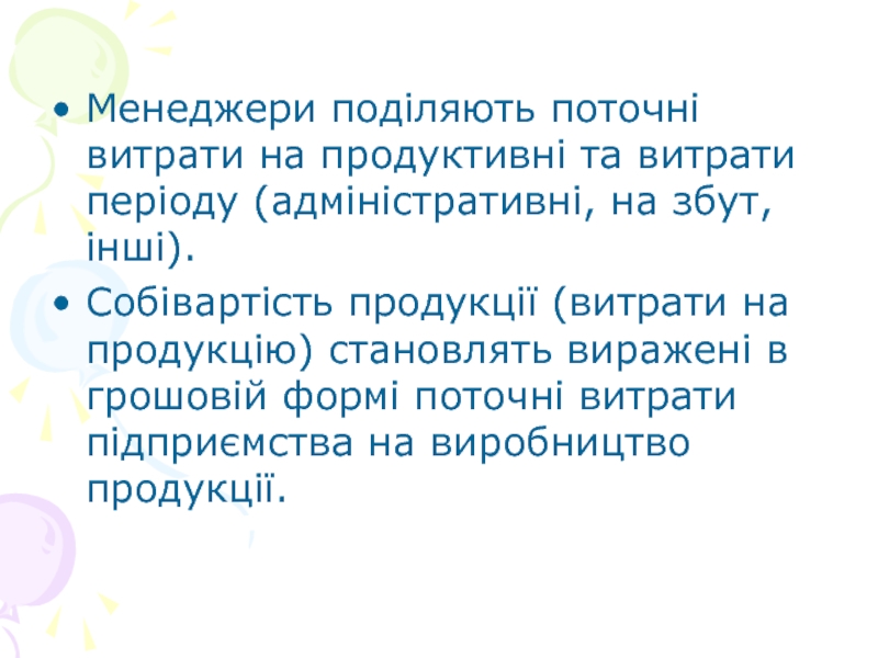 Слайд 14Менеджери поділяють поточні витрати на продуктивні та витрати періоду (адміністративні,