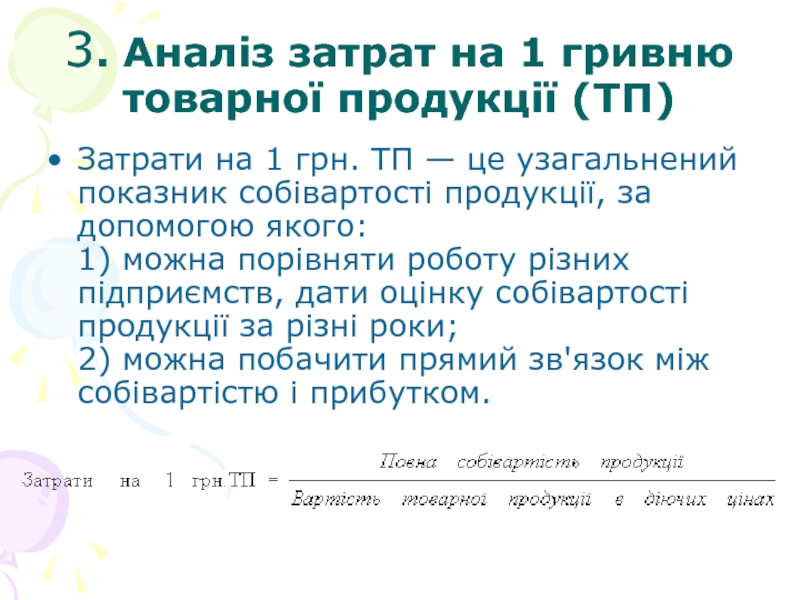 Слайд 483. Аналіз затрат на 1 гривню товарної продукції (ТП)