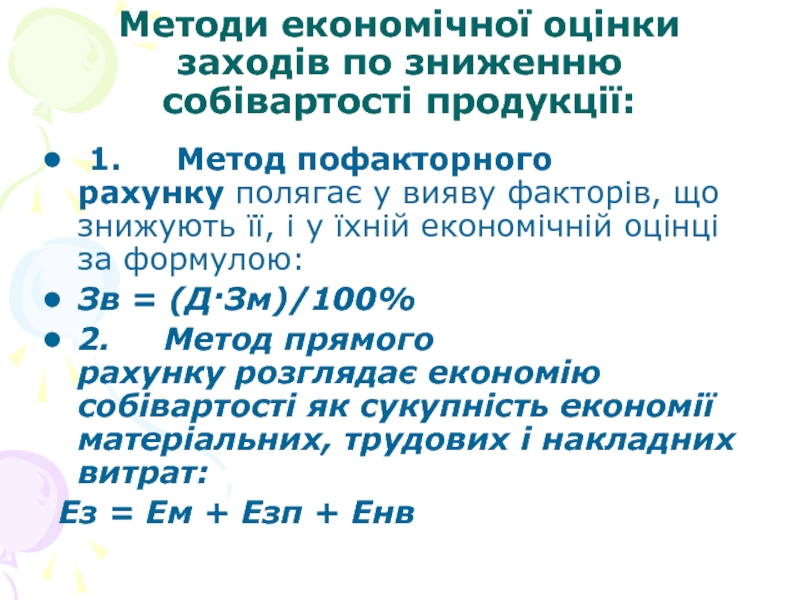 Слайд 58Методи економічної оцінки заходів по зниженню собівартості продукції: