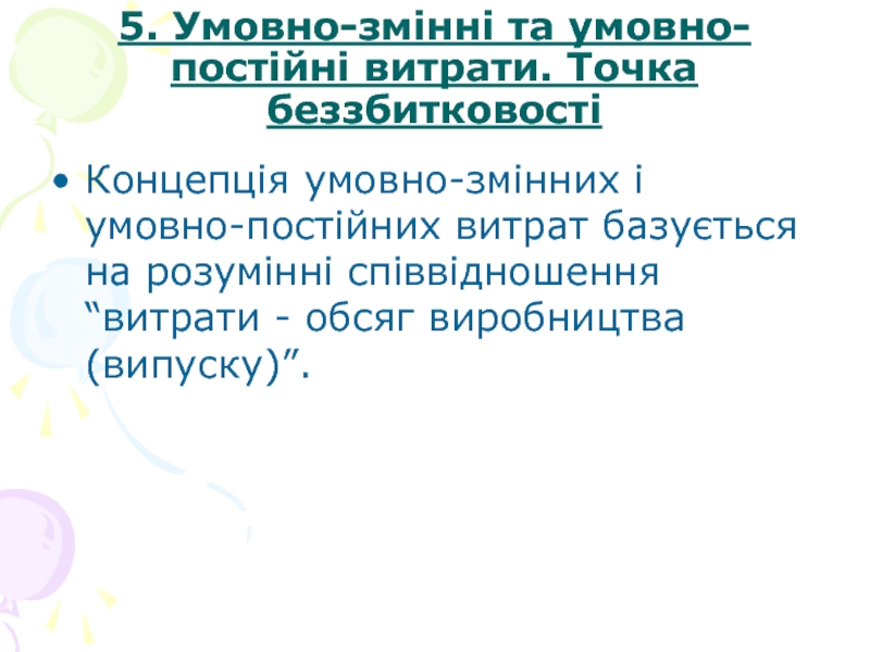 Слайд 335. Умовно-змінні та умовно-постійні витрати. Точка беззбитковості