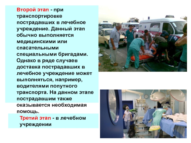 спасательными специальными бригадами. Однако в ряде случаев доставка пострадавших в лечебное учреждение может выполняться, например, водителями попутного транспорта. На данном этапе пострадавшим также оказывается необходимая помощь.