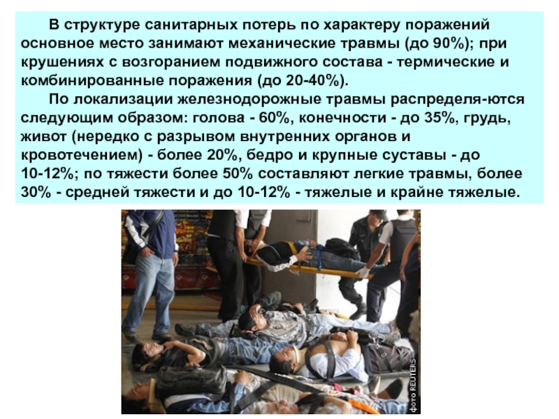 травмы - до 90%. Особенностью механических повреждений при столкновении и сходах подвижного состава являются преимущественно ушибленные раны, закрытые переломы конечностей и закрытые черепно-мозговые травмы (до 50%). Наряду с этим более чем в 60% случаев отмечаются множественные и сочетанные травмы и случаи травм с синдромом длительного сдавления, который имеет место при невозможности быстрого высвобождения пораженных из деформиро-ванных конструкций вагонов и локомотивов. Эти особенности железнодорожных травм наиболее четко проявляются при крупномасштабных катастрофах.