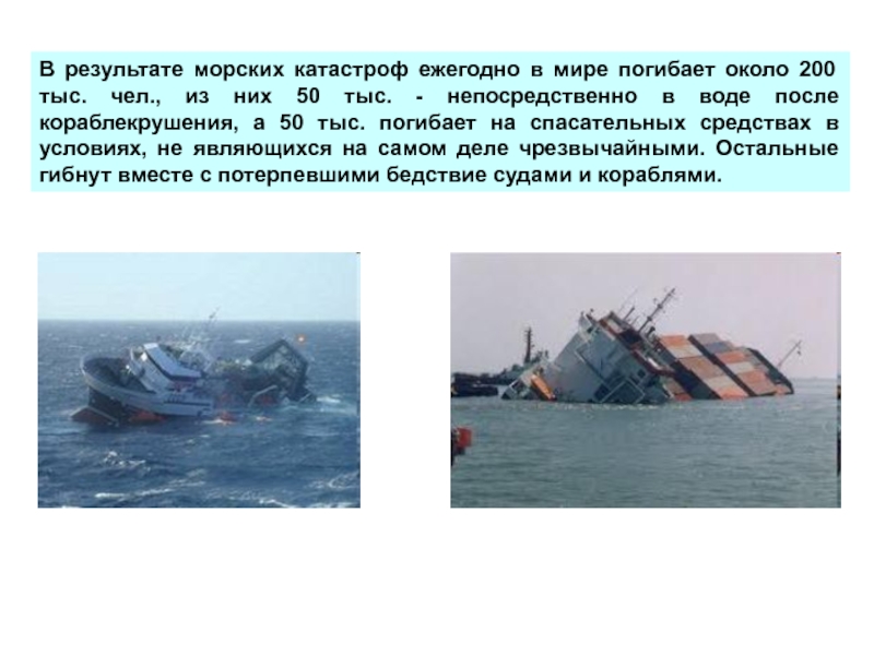 Слайд 15В результате морских катастроф ежегодно в мире погибает около 200